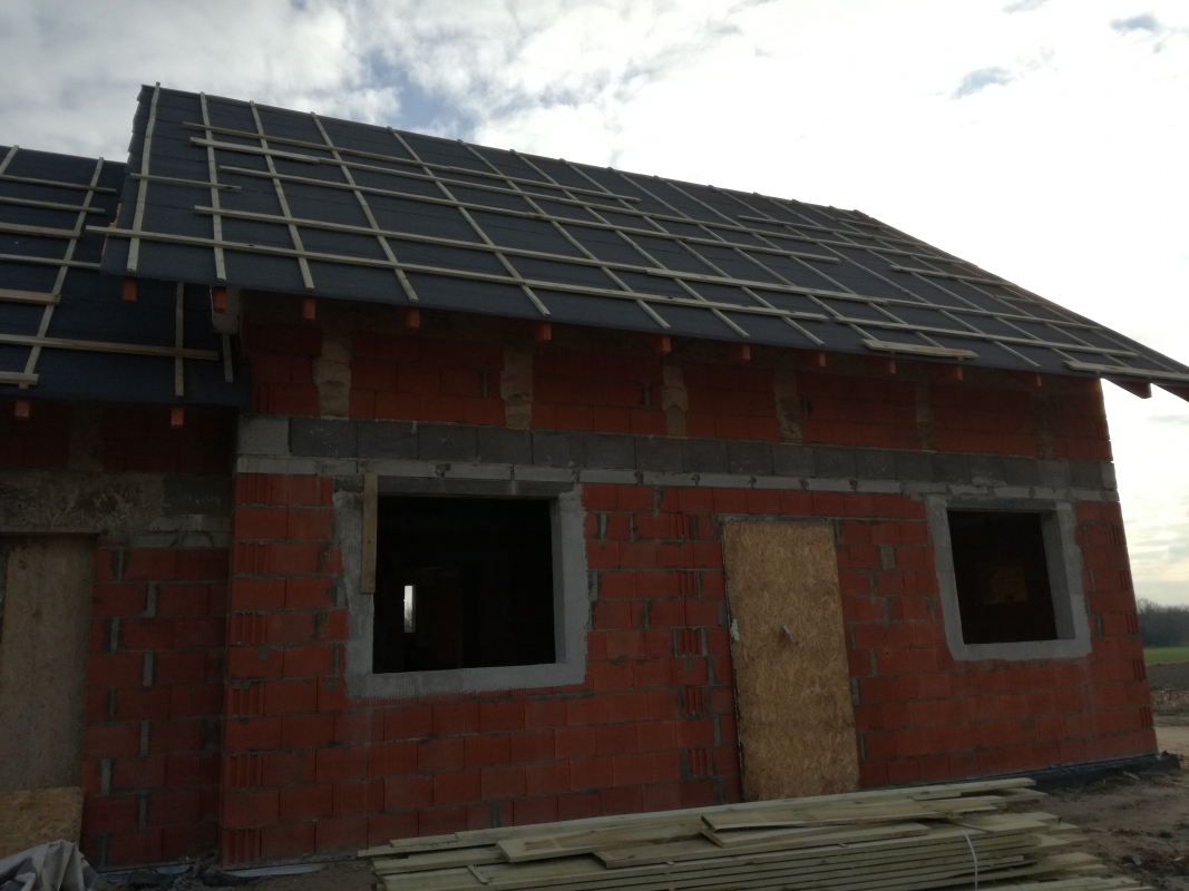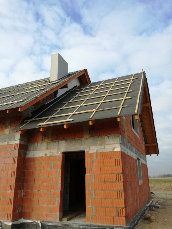 Cieśla zakończył etap deskowania, ocieplenia i papowania. Na razie to tyle. Teraz będzie robiona konstrukcja frontowego zadaszenia - muszę tylko wykopać i zalać stopy fundamentowe pod tę konstrukcję. Wykonam to jak tylko nie będzie mrozu.