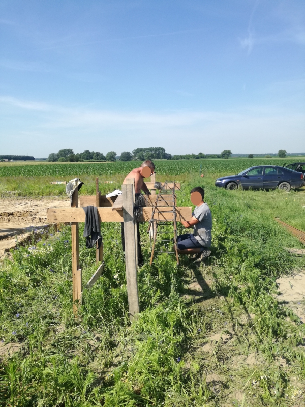 W między czasie musiałem przestawić garaż. Osadziłem bloczki i wraz z braćmi oraz majstrami przenieśliśmy go w wyznaczone mijsce w róg działki.